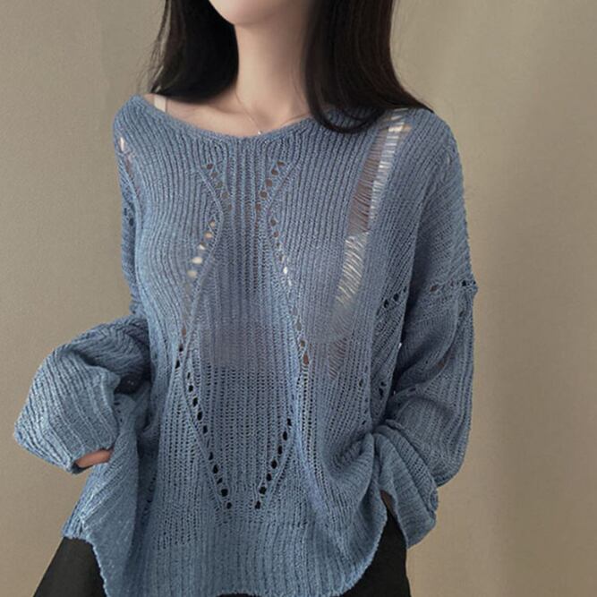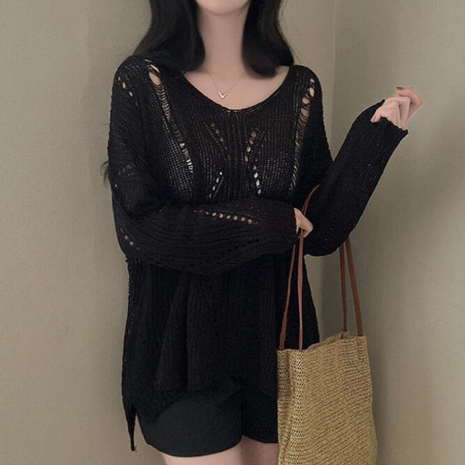 ・透け感のある爽やかな緩いシルエットの 透かし編みニットです。 ・タンクトップやキャミソールなどに重ねて着るだけで、今年っぽいレイヤードスタイルを楽しめます。