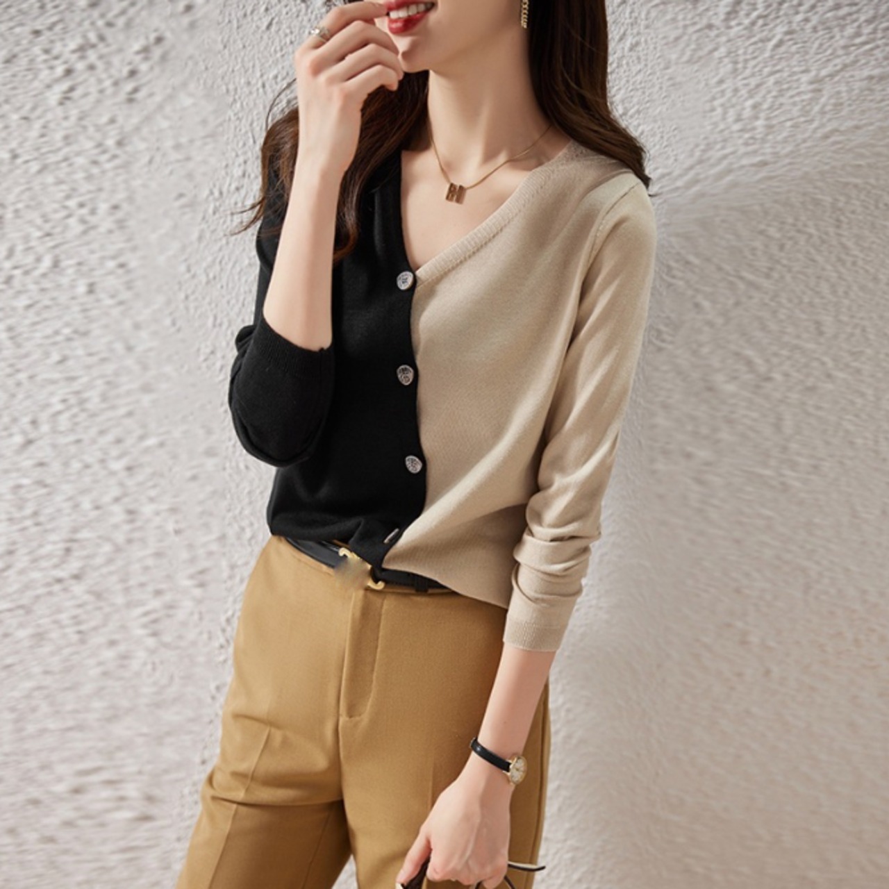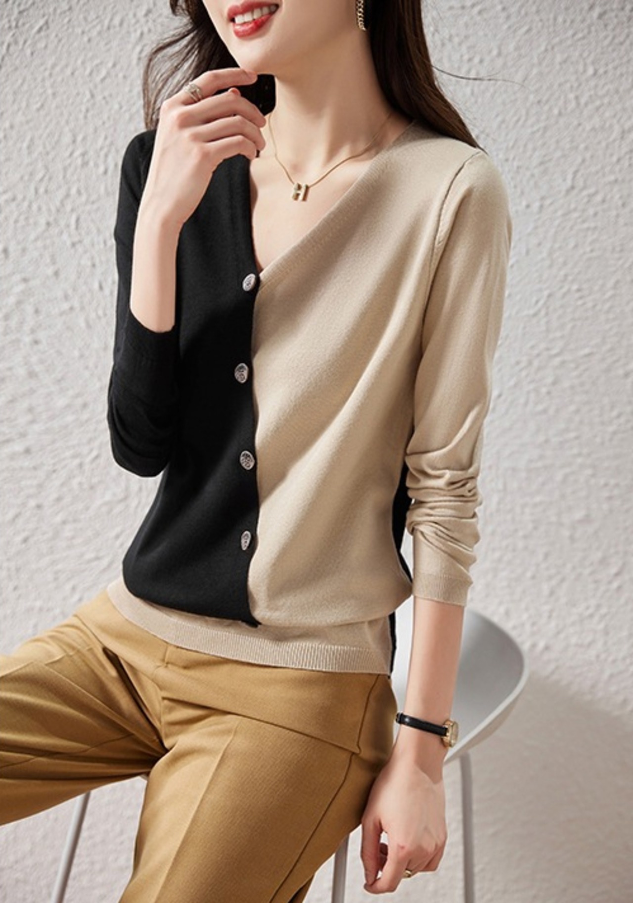 ・深いVネックでデコルテの厚みをすっきり見せる。