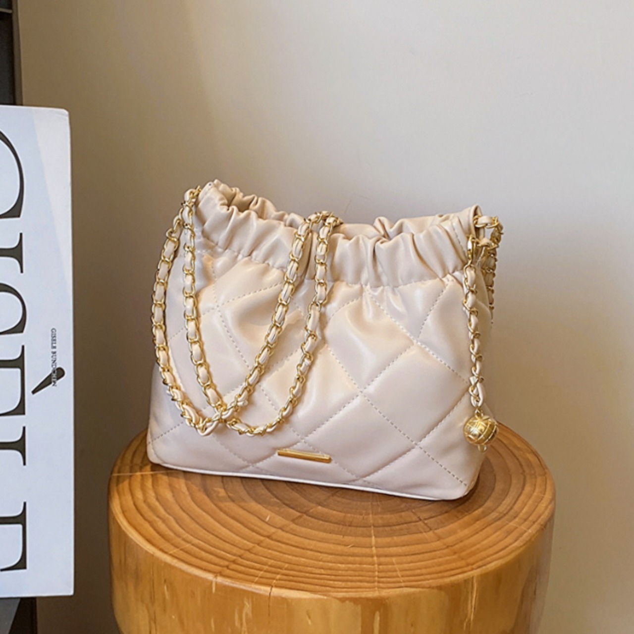 ・さりげない光沢感が上品な印象のバケツバッグ。
