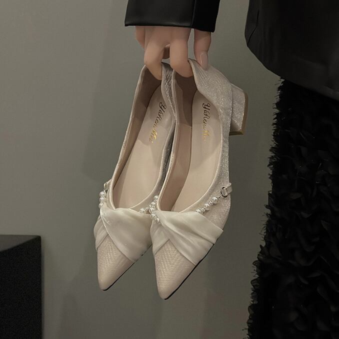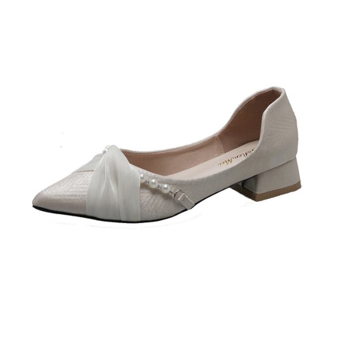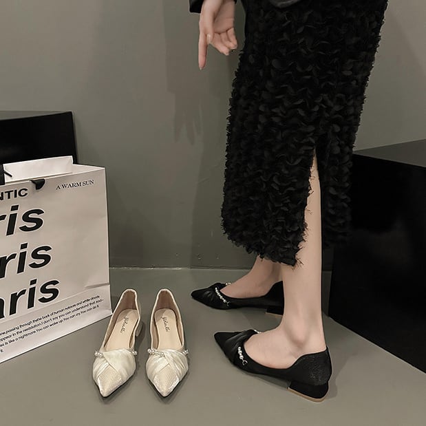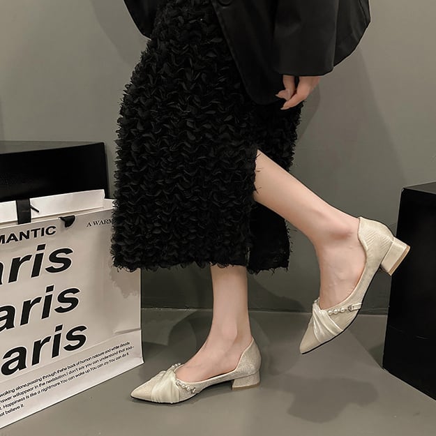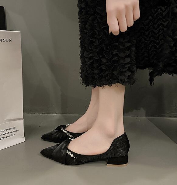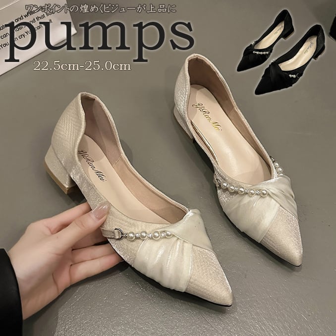 ・ワンポイントの煌めくビジューが上品なローヒールパンプス。