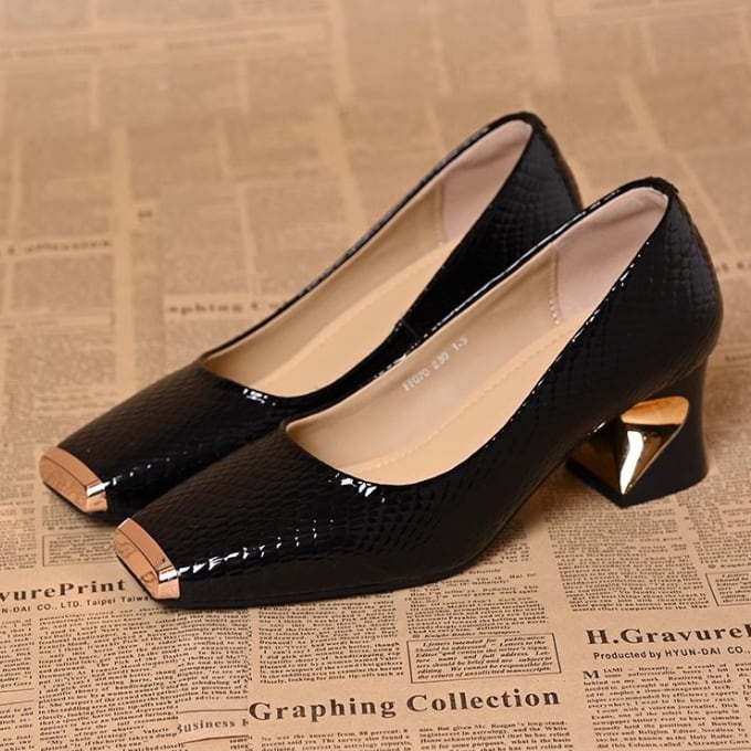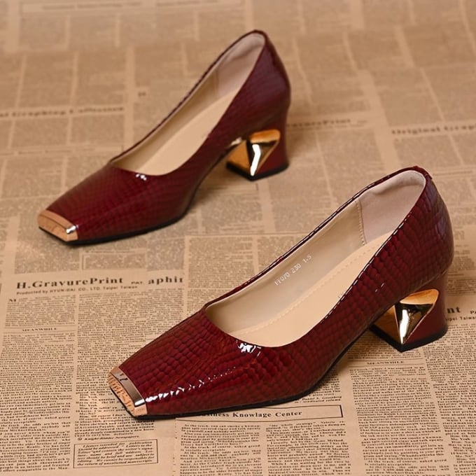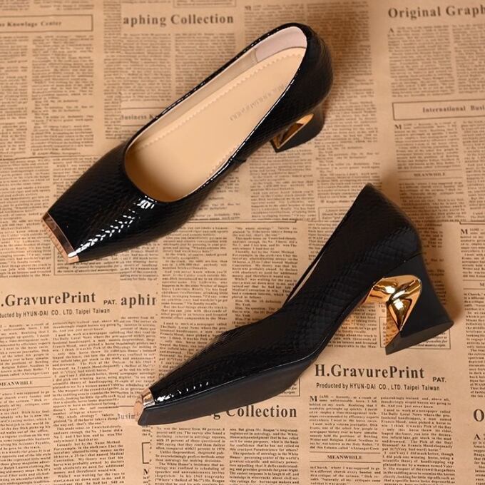 2025新作 レディース レザー調 チャンキーヒール パンプス スクエアトゥ 太ヒール ツヤ感