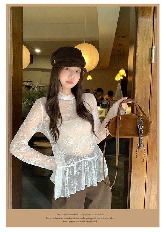 ・ホワイトのハイネック仕様で、ほんのり透け感のある長袖トップスです。