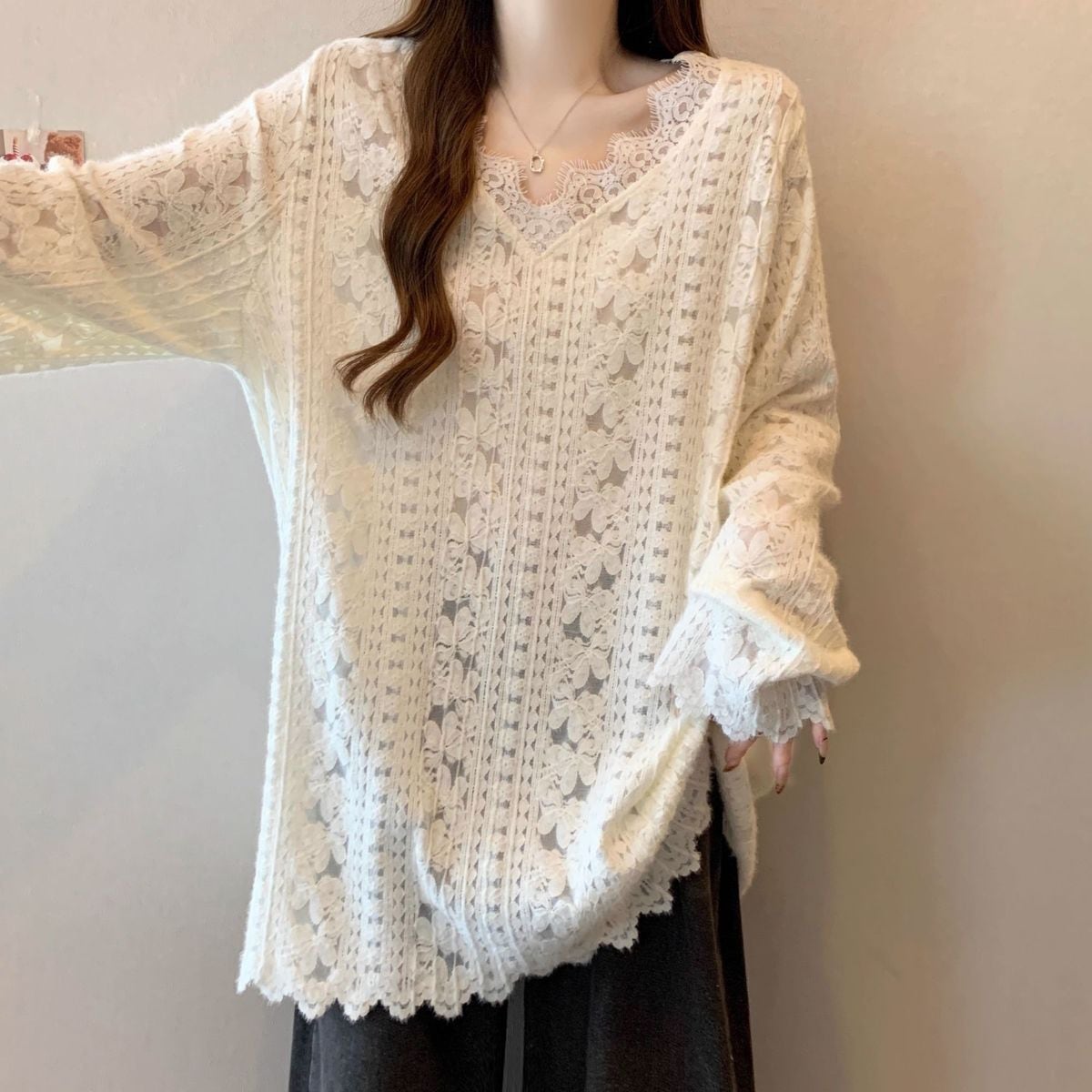 ・シンプルな無地でコーディネートしやすく、Vネックのレースデザインが上品で女性らしい雰囲気を演出します。