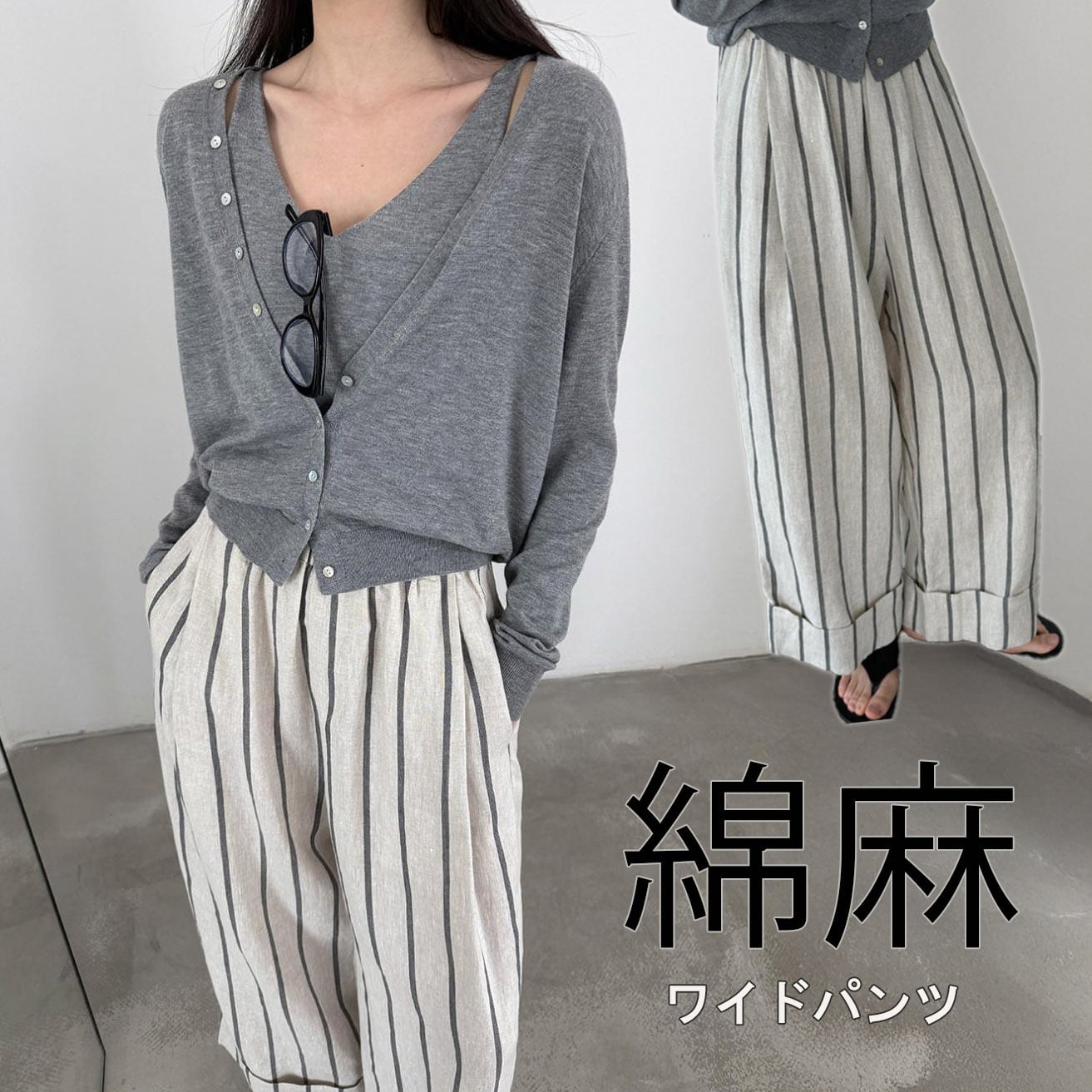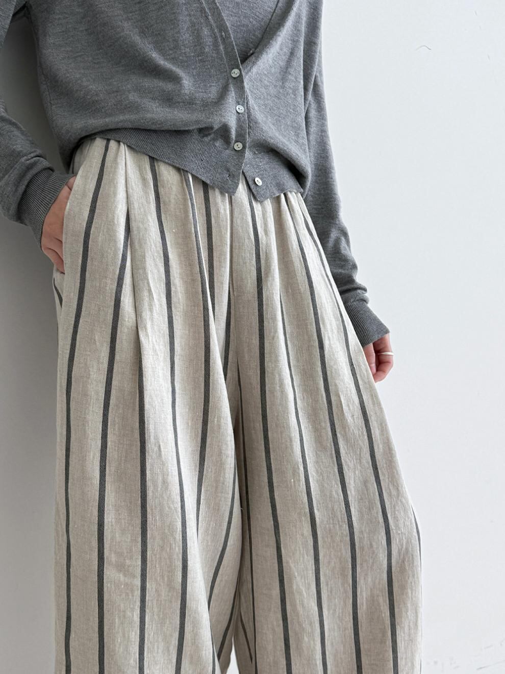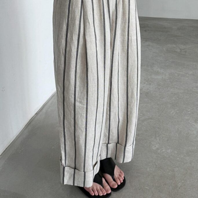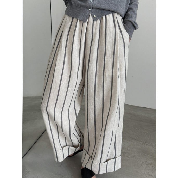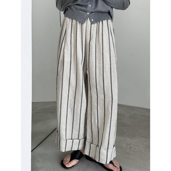 2026新作 レディース パンツ ズボン リネン ワイドパンツ ウエストゴム ストライプ 楽ちん 綿麻 ゆったり